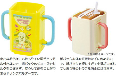 小さなお子様にも持ちやすい両手ハンドル付きなので、紙パックのジュースやミルクをこぼさず、安心して飲むことができるドリンクホルダーです。